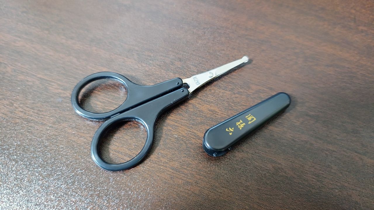 このハサミの最大の特徴は、刃の先端が丸く加工されている点です。これは無駄毛処理用であることに起因していますが、この「先端が丸い」という安全設計が携帯用として非常に優れているポイントです。
