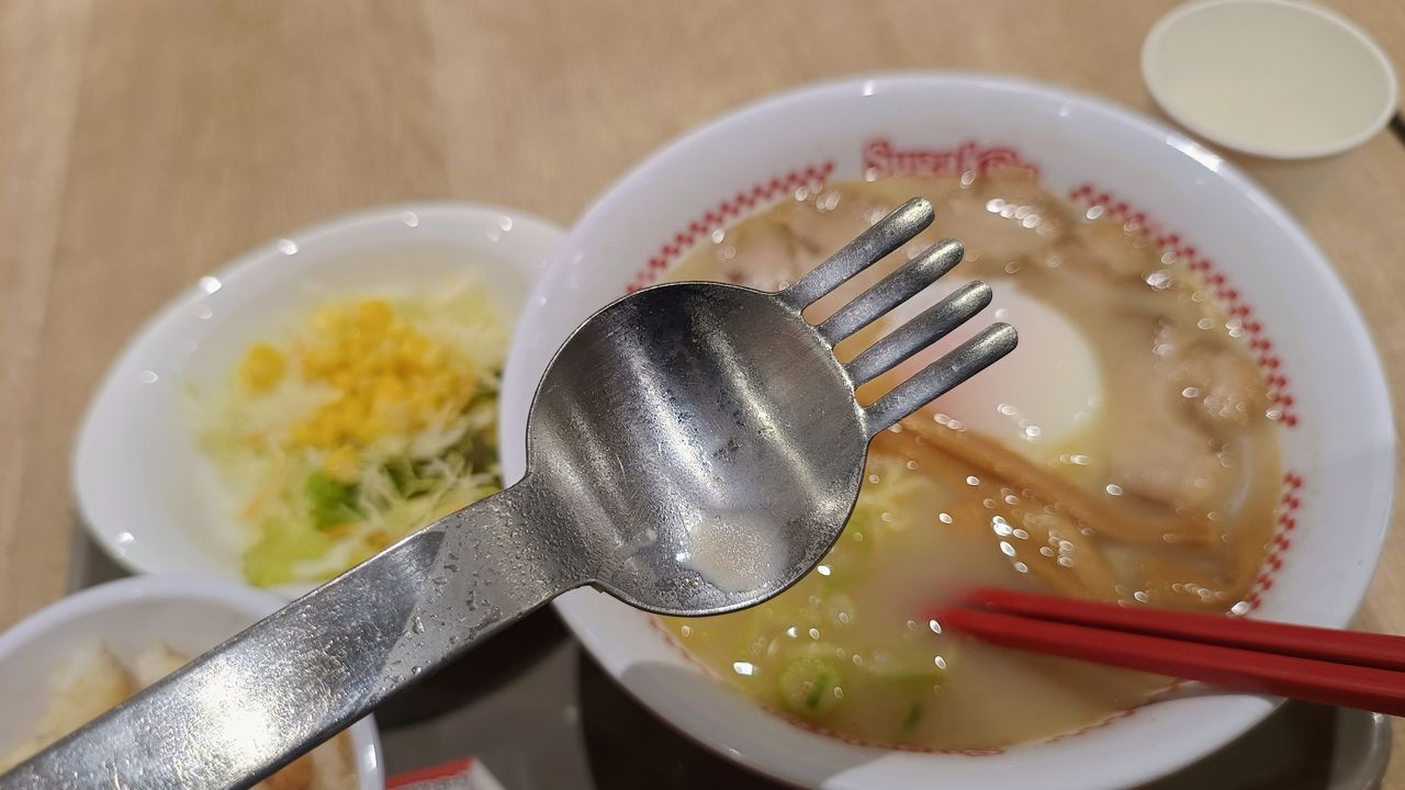 そして、最も驚いたのが食器です。スープを飲もうと手に取ったスプーンの先に、なんとフォークのような歯がついているではありませんか。後で調べてみると、これはラーメンフォークという正式名称がある有名な道具なんですね。